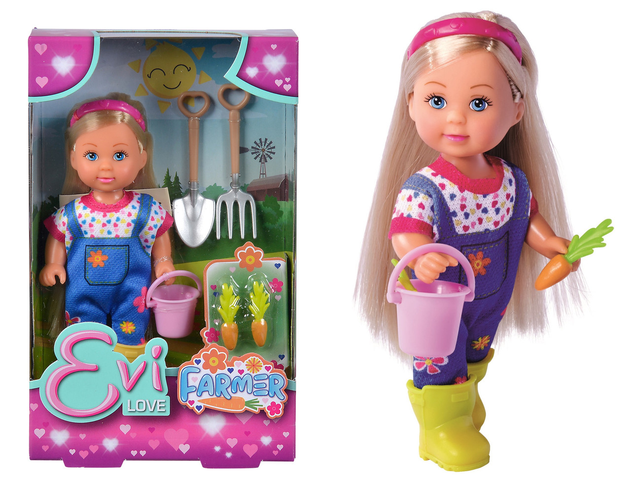 Маленька Еві дуже активна і любить проводити час на свіжому повітрі у саду. Сьогодні вона вирушає працювати на ферму. Для цього в неї є все необхідне з набором "Фермер". Лише візьміть лопату та легко посадіть морквинку у ґрунт. Лялечка одягнена у стильний синій комбінезон з квітковим принтом, має рожевий обруч на зачісці, та взута у жовті чобітки. До набору входить: лялька Еві, лопата, вила, відро, дві морквини. Приєднуйся до Еві та проведіть весело час разом!
