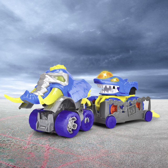 Компанія Dickie представляє крутезну машинку "Монстр Рейнджер Акула". Автомобіль-акула безпечно зберігається на знімному причепі вантажівки-мамонта та закріплюється ланцюгом. Але коли двері багажника відкриваються, безстрашна акула стикається з монстром. Мамонт знає, як захищатися: натиснувши на важіль на вантажівці, мамонт нахиляє голову та розгойдує свої вражаючі бивні вгору - і просто збиває акулу. Цей дивовижний підйомний механізм вимагає певних навичок і сприяє розвитку дрібної моторики та творчих здібностей дітей. І великий рейнджер-транспортер (32 см.), і менший монстр акула (15 см.) мають вільний хід колес та міцні гумові колеса, два монстр-траки також можна використовувати окремо. Виготовлений набір з високоякісних матеріалів, має деталізований дизайн, світлові та звукові ефекти.